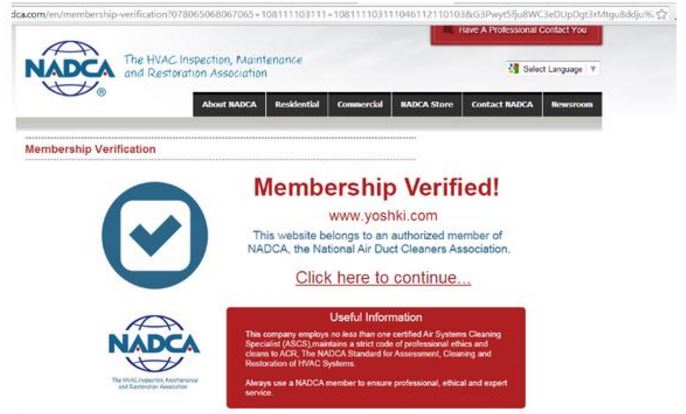 NADCA provides certificates to each of its members which list the company’s name and when their membership expires. NADCA members also use the NADCA verification logo on their website so that consumers can click on the logo to verify membership.