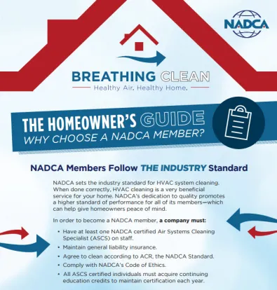 The National Air Duct Cleaners Association (NADCA) is dedicated to helping homeowners become familiar with the air duct cleaning process so you can make informed decisions. Explore the links below to learn about the benefits of duct cleaning, common signs that ducts need to be cleaned, proper cleaning methods, cost and time estimates, how to avoid scams, why you should choose a NADCA member, and more.