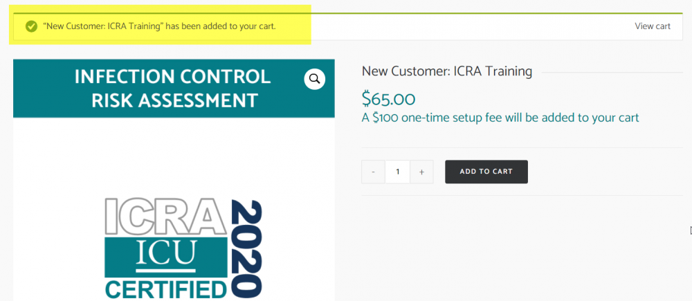 The training course is $65, plus a one-time set up fee of $100 for new registrants. This allows you to then take advantage of all of the other training courses available through the ICU! Once you add the training course to your cart, a confirmation will appear on your screen, as shown below.